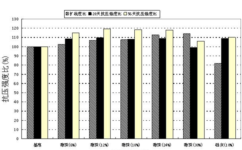 混凝土抗?jié)B性效果明顯??箖龊涂谷诒}性能用CDF法作試驗(yàn)56次凍融循環(huán)結(jié)果,優(yōu)于水泥,更明顯優(yōu)于普通粉煤灰和硅灰(加硅灰的混凝土抗凍性不好)?!俺?xì)粉”完全可以取代硅灰用于配制高性能混凝土。根據(jù)實(shí)驗(yàn),用42.5級水泥作水泥砂漿進(jìn)行性能對比實(shí)驗(yàn),在相同水/膠比情況下用“超細(xì)粉” 等量替代水泥,“超細(xì)粉”摻入量分別為6%、12%、18%、24%和30%,硅灰摻量為10%。其擴(kuò)展度和28天、56天強(qiáng)度比見。