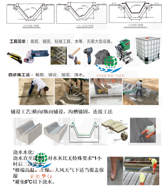 混凝土毯使用極為簡單:打開卷材、切割、鋪設(shè)、固定、澆水。澆水24小時后,混凝土毯抗折強(qiáng)度可高達(dá)10MPa以上。增強(qiáng)纖維可增強(qiáng)韌性,防止開裂,并且使整個材料結(jié)構(gòu)有極強(qiáng)的整體性,抵御極強(qiáng)的變形沖擊,機(jī)械壽命長。